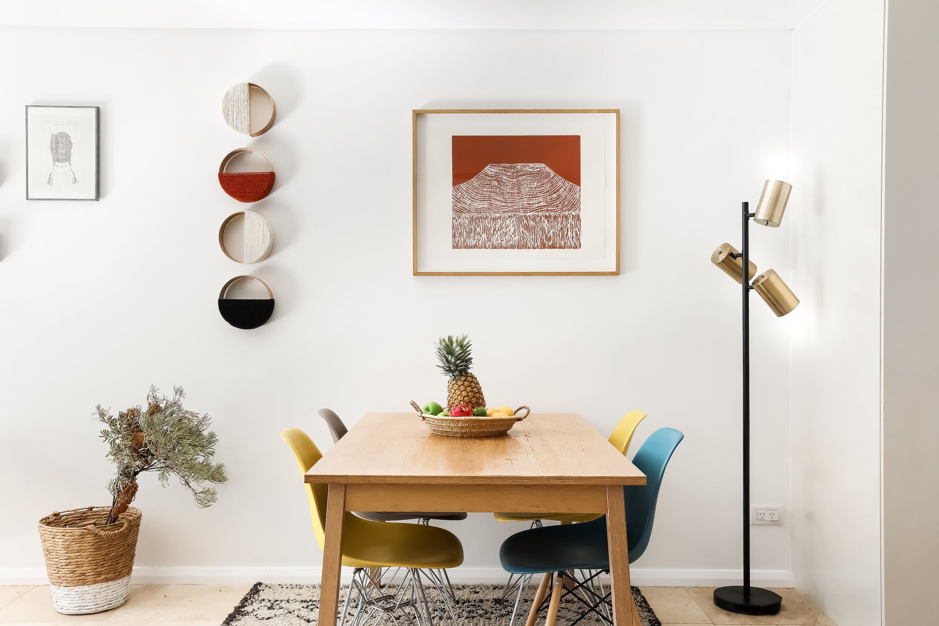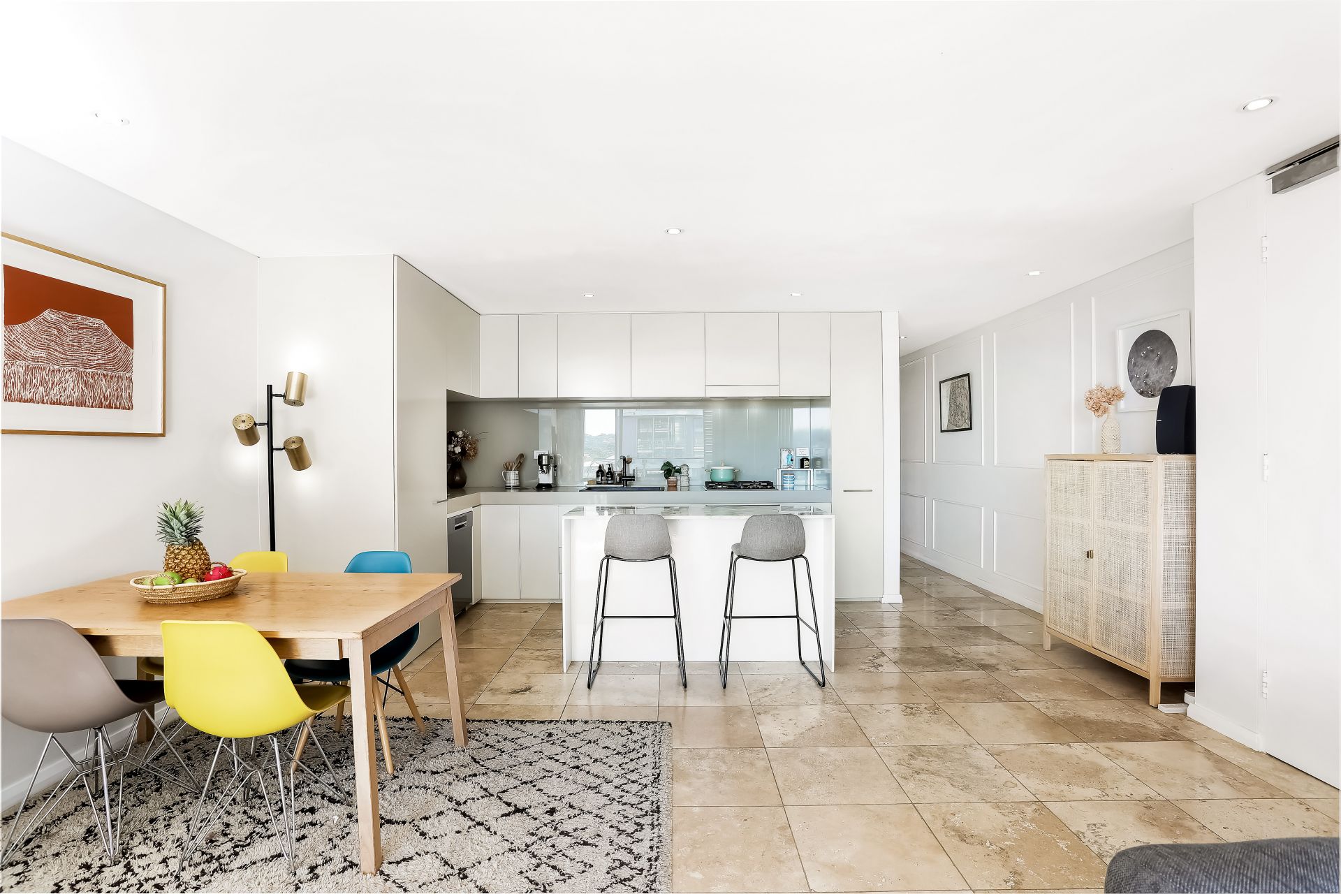 * Sunlit open plan living and dining with travertine floors and air-conditioning